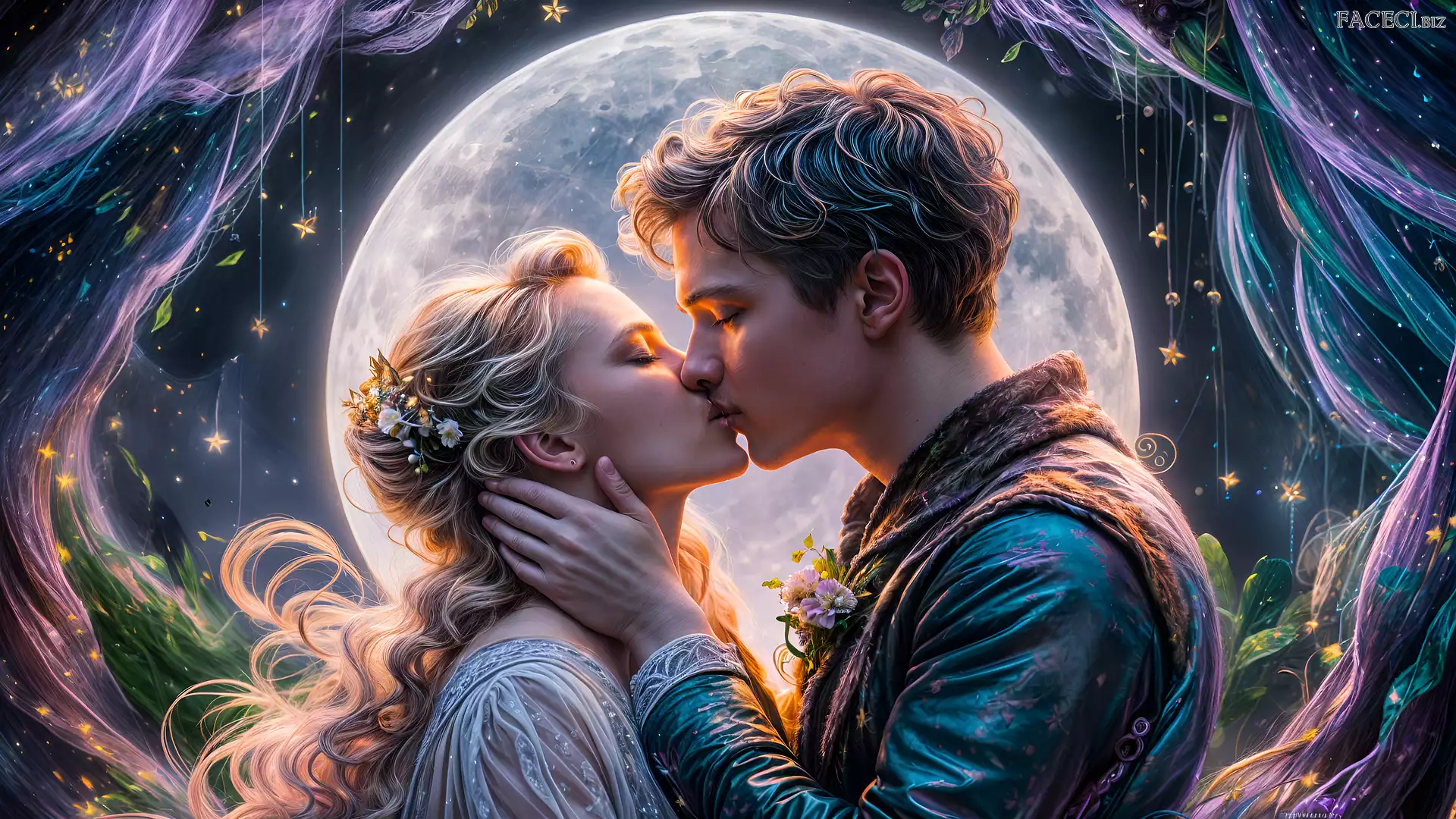 Grafika, Księżyc, Kobieta, Mężczyzna, Para, Pocałunek - faceci.biz